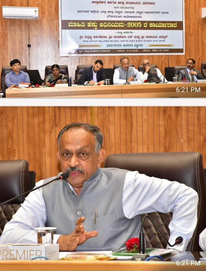 ಅವರು ಇಂದು (ಜ.31) ಬೆಳಿಗ್ಗೆ ಜಿಲ್ಲಾ ಪಂಚಾಯತ ಸಭಾಂಗಣದಲ್ಲಿ ಕರ್ನಾಟಕ ರಾಜ್ಯ ಮಾಹಿತಿ ಆಯೋಗವು ಧಾರವಾಡ ಜಿಲ್ಲಾಡಳಿತ ಮತ್ತು ಜಿಲ್ಲಾ ಪಂಚಾಯತ ಸಹಯೋಗದಲ್ಲಿ ವಿವಿಧ ಇಲಾಖೆಗಳ ಸಾರ್ವಜನಿಕ ಮಾಹಿತಿ ಅಧಿಕಾರಿಗಳಿಗೆ ಹಾಗೂ ಪ್ರಥಮ ಮೇಲ್ಮನವಿ ಅಧಿಕಾರಿಗಳಿಗೆ ಆಯೋಜಿಸಿದ್ದ ಮಾಹಿತಿ ಹಕ್ಕು ಅಧಿನಿಯಮ-2005 ರ ಕಾರ್ಯಾಗಾರ ಮತ್ತು ಅಧಿಕಾರಿಗಳೊಂದಿಗೆ ಸಂವಾದ ಕಾರ್ಯಕ್ರಮಲ್ಲಿ ಭಾಗವಹಿಸಿ, ಮಾತನಾಡಿದರು.