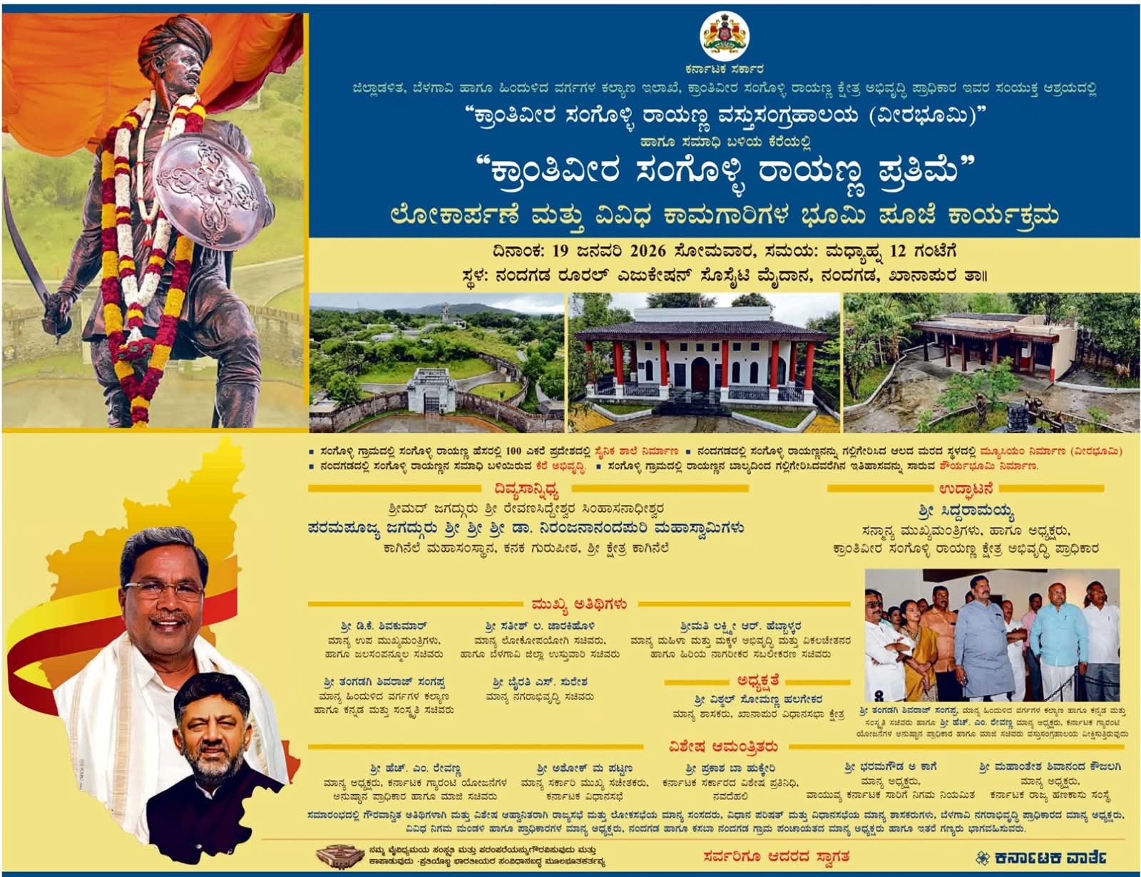 ಕ್ರಾಂತಿವೀರ ಸಂಗೊಳ್ಳಿ ರಾಯಣ್ಣ ವಸ್ತುಸಂಗ್ರಹಾಲಯ (ವೀರಭೂಮಿ ಹಾಗೂ ಸಮಾಧಿ ಬಳಿಯ ಕೆರೆಯಲ್ಲಿ ಕ್ರಾಂತಿವೀರ ಸಂಗೊಳ್ಳಿ ರಾಯಣ್ಣ ಪ್ರತಿಮೆ ಲೋಕಾರ್ಪಣೆ ಮತ್ತು ವಿವಿಧ ಕಾಮಗಾರಿಗಳ ಭೂಮಿ ಪೂಜೆ ಕಾರ್ಯಕ್ರಮ ಜರುಗುವುದು..