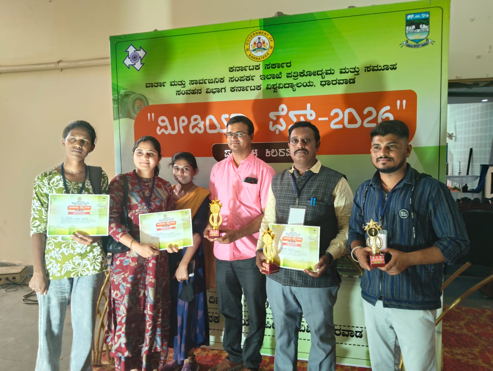 ವಾರ್ತಾ ಮತ್ತು ಸಾರ್ವಜನಿಕ ಸಂಪರ್ಕ ಇಲಾಖೆಯಿಂದ ಕರ್ನಾಟಕ ವಿಶ್ವವಿದ್ಯಾಲಯದ ಕನಕ ಅಧ್ಯಯನ ಪೀಠದ ಸಭಾಂಗಣದಲ್ಲಿ ಎರಡು ದಿನಗಳು ನಡೆದ ಬೆಳಗಾವಿ ಕಂದಾಯ ವಿಭಾಗ ವ್ಯಾಪ್ತಿಯ ಪತ್ರಿಕೋದ್ಯಮ ವಿದ್ಯಾರ್ಥಿಗಳಿಗಾಗಿ ನಡೆದ ಮಾಧ್ಯಮ ಹಬ್ಬ ಸ್ಪರ್ಧೆಯಲ್ಲಿ ವಿದ್ಯಾರ್ಥಿಗಳಾದ ಸಂಗನಗೌಡ ಹೂವನ್ನವರ, ಸುಜಾತಾ ಮಾಮಲೇಪಟ್ಟಣಶಟ್ಟರ್, ದೀಪಾ ಕೊಪ್ಪದ, ದೇವರಾಜ ಹಂಚಿನಮನಿ, ಪ್ರವೀಣ ಅರಳಿಕಟ್ಟಿ ಭಾಗವಹಿಸಿ, ಕಿರು ಸಂದರ್ಶನ ಸ್ಪರ್ಧೆಯಲ್ಲಿ ದ್ವಿತೀಯ, ಪಿಟಿಸಿ ಸ್ಪರ್ಧೆಯಲ್ಲಿ ದ್ವಿತೀಯ, ಸ್ಕ್ರೀಪ್ಟ್ ಹಾಗೂ ವರದಿ ಬರವಣಿಗೆ ಸ್ಪರ್ಧೆಯಲ್ಲಿ ತೃತೀಯ ಸ್ಥಾನವನ್ನು ಪಡೆದುಕೊಂಡು ವಿಭಾಗ ಹಾಗೂ ವಿಶ್ವವಿದ್ಯಾಲಯಕ್ಕೆ ಕೀರ್ತಿ ತಂದಿದ್ದಾರೆ ಎಂದು ಕರ್ನಾಟಕ ಜಾನಪದ ವಿಶ್ವವಿದ್ಯಾಲಯದ ಪತ್ರಿಕೋದ್ಯಮ ಮತ್ತು ಸಮೂಹ ಸಂವಹನ ವಿಭಾಗದ ಮುಖ್ಯಸ್ಥರಾದ ಡಾ.ವೆಂಕನಗೌಡ ಪಾಟೀಲ ಅವರು ಪ್ರಕಟಣೆಯಲ್ಲಿ ತಿಳಿಸಿದ್ದಾರೆ.