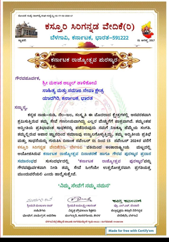 ಸುಮಾರು ವರ್ಷಗಳಿಂದ ಈ ಸಂಸ್ಥೆ ಇವರ ಸಂಯೋಗದಲ್ಲಿ ಈ ವರ್ಷದ ಕನ್ನಡ ರಾಜ್ಯೋತ್ಸವ ಅದ್ಧೂರಿ ಸಮಾರಂಭ ಪ್ರಯುಕ್ತ ಬೆಂಗಳೂರಿನ ಭಾರತ ಸ್ಕೌಟ್ ಅಂಡ್ ಗೈಡ್ಸ್ ಅಡಿಟೋರಿಯಂ ಮಹಾರಾಣಿ ಕಾಲೇಜ ಹತ್ತಿರ ಕೊಂಡೋಜಿ ಬಸಪ್ಪ ಸಭಾಭವನ ಬೆಂಗಳೂರು, ಬರವಣಿಗೆಯ ಮತ್ತು ಸಾಹಿತ್ಯ ಕ್ಷೇತ್ರದಲ್ಲಿ ನನ್ನನ್ನು ಗುರುತಿಸಿ